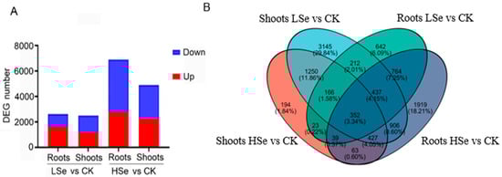 Differentially expressed genes (DEGs) in rice roots and shoots under Se treatments. (A) Number of upregulated and downregulated DEGs in roots and shoots of rice seedlings under LSe and HSe conditions compared to the CK. Red bars indicate upregulated genes, and blue bars indicate downregulated genes. (B) Venn diagram showing the overlap of DEGs among different comparisons (roots LSe vs. CK, shoots LSe vs. CK, roots HSe vs. CK, and shoots HSe vs. CK). Each section of the diagram represents the number and percentage of shared and unique DEGs in the respective conditions.
