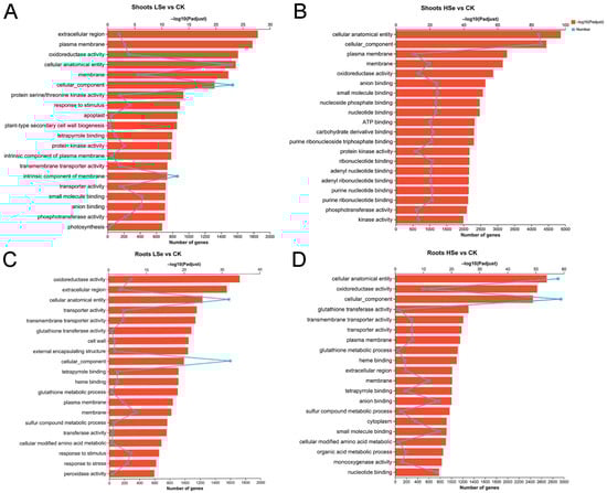 GO enrichment analysis of differentially expressed genes (DEGs) in rice shoots and roots under LSe and HSe treatments compared to CK. (A) Shoots LSe vs. CK, (B) shoots HSe vs. CK, (C) roots LSe vs. CK, and (D) roots HSe vs. CK. The x-axis shows the number of genes, and the y-axis lists enriched GO terms. The blue line represents the −log10 (Padjust) values, indicating the significance of enrichment.
