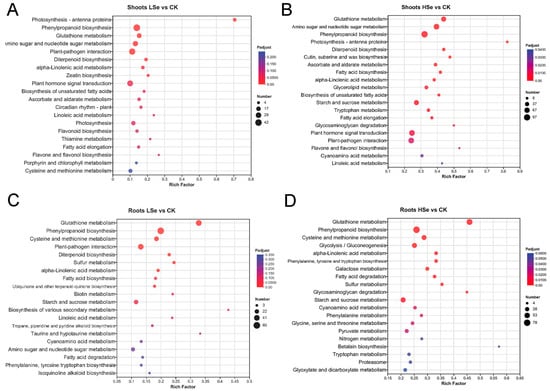 KEGG pathway enrichment analysis of differentially expressed genes (DEGs) in rice shoots and roots under different treatments. (A) Shoots LSe vs. CK, (B) shoots HSe vs. CK, (C) roots LSe vs. CK, and (D) roots HSe vs. CK. The x-axis represents the rich factor, indicating the ratio of DEGs in each pathway, while the y-axis lists the enriched KEGG pathways. Dot size reflects the number of DEGs, and the color gradient represents the significance level (Padjust), with red indicating higher significance.