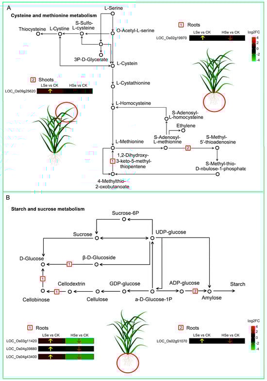In Cys and Met metabolism, two genes, LOC_Os09g25620 and LOC_Os02g19970 were all upregulated by low Se treatment and downregulated by high Se treatment (Figure 7A). In addition, LOC_Os03g11420, LOC_Os04g39880, LOC_Os04g43400 and LOC_Os02g51070 in starch and sucrose metabolism were upregulated by low Se treatment (Figure 7B), while they were all reduced by high Se treatment. These results imply these genes may play a significant role in the response of rice seedlings to different concentrations of Se treatments, and the pathways involving the expression of these genes are also crucial for the response of rice seedlings to Se stress.