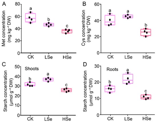 Concentrations of Met, Cys, and starch in rice seedlings under CK, LSe and HSe treatments. (A) Met concentration, (B) Cys concentration, (C) starch concentration in shoots, and (D) starch concentration in roots. Data are represented as the mean ± standard deviation (SD). Different letters indicate significant differences under different Se treatments (p < 0.05, Student’s t-test).