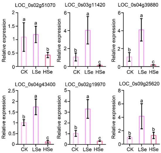 A total of six genes were randomly selected and validated by quantitative real-time (qRT-PCR) to confirm the reliability of sequencing date (Figure 9). Among them, one gene encodes conserved peptide uORF-containing transcript (CPuORF8) (LOC_Os09g25620), one gene encodes aminotransferase, one gene encodes starch synthase (LOC_Os02g51070) and each of the three genes encodes Oryza sativa β-glucosidase6 (Os3bglu6), Oryza sativa β-glucosidase 12 (Os4bglu12) and Oryza sativa β-glucosidase 17 (Os4bglu17), members of the GH1 family (LOC_Os03g11420, LOC_Os04g39880, LOC_Os04g43400). The genes LOC_0s02g51070, LOC_0s03g11420, LOC_0s04g39880, LOC_0s04g43400, LOC_0s02g19970, and LOC_0s09g25620 exhibit significantly higher expression levels in the LSe treatment group compared to the CK and HSe groups. Overall, the trend indicated that these genes were upregulated under low Se conditions and significantly suppressed under HSe conditions. The results showed that the changes were basically consistent with the results of transcriptome sequencing. These selected and validated genes provide a more comprehensive understanding of the gene response patterns under Se stress and their contributions to the overall metabolic network.