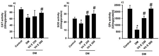 | Parameter | Control | DM | DM + Vit E 250 mg/kg | DM + Vit E 500 mg/kg |