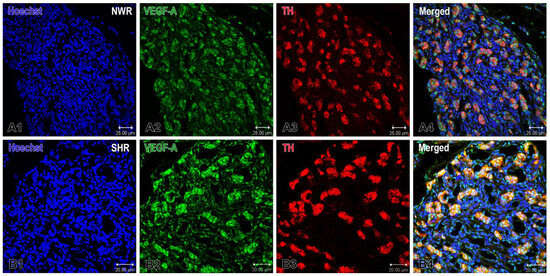 Immunofluorescence and confocal microscopy revealed a strongly increased protein expression of both VEGF-A and VEGF-B in glomus and endothelial cells in the enlarged CB glomeruli of SHRs compared with that in NWR. Specifically, we observed that a subset of glomus cells and some endothelial cells in the CB were immunoreactive to VEGF-A and immunostaining of the glomus cells was stronger in the hypertensive than that in normotensive rats (Figure 1). We calculated the correlation index between TH and VEGF-A in both animal strains using the ImageJ colocalization plugin. In normotensive animals, the correlation index was 0.47, with the mean threshold value for TH being 34.23 and the mean threshold value for VEGF-A being 34.51. In hypertensive animals, the correlation index was 0.60, the mean threshold values for TH were 48.28, and for VEGF-A were 54.11. These results imply that hypertensive animals show both a higher expression (as inferred by higher threshold values) and a higher colocalization (correlation index) of TH and VEGF-A, pointing to a potentially significant interaction between sympathetic innervation and angiogenic pathways in the context of hypertension.