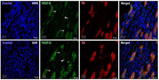 Representative images of double immunofluorescence staining for VEGF-B (green), TH (red) and Hoechst (blue as a nuclear counterstain) in the normotensive and hypertensive carotid body. (A1–A4) Immunostained sections of the carotid body depicting the expression of VEGF-B in glomus (arrows) and endothelial (arrowhead) cells in normotensive Wistar rats (NWR). A few endothelial cells are immunostained for this protein (A2) and a subset of co-stained glomus cells (orange) are visualized in a merged image (A4). (B1–B4) Representative images of the carotid body in spontaneously hypertensive rats (SHR) showing an increased expression of VEGF-B in glomus cells (B4). Original magnification ×63, scale bars equal 10 µm.