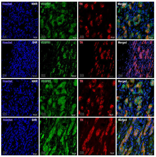 The statistical analysis revealed an altered and significantly increased expression of VEGF-A and VEGF-B and their receptor VEGFR2 in glomus cells of CB glomeruli in SHRs, compared with NWR controls, as highlighted by the double immunofluorescence technique with the glomus cell marker TH. Conversely, VEGFR1 was much less expressed in glomus cells of hypertensive CB compared to age-matched controls (Figure 4).