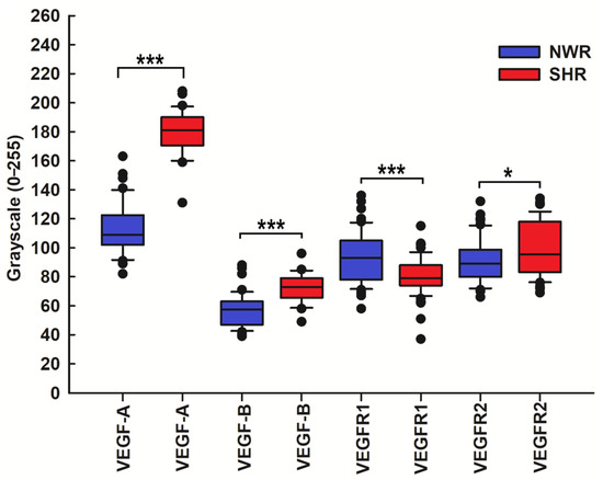 Statistical comparison of the immunostaining intensity for VEGF-A, VEGF-B, and VEGF receptors in NWRs (blue boxes) and SHRs (red boxes). Note that the immunostaining intensity for the VEGF-A in the chemosensory glomus cells of the SHR was stronger (median, 181 versus 109, *** p ≤ 0.001) than that observed in NWR rats. An enhanced and statistically significantly increased expression of vascular endothelial growth factor-B (VEGF-B) (median, 73 versus 57.5, *** p ≤ 0.001) and its receptor VEGFR2 (median, 95.5 versus 89, * p = 0.036) in glomus cells of SHR compared with NWR controls was also observed, as highlighted by the double labeling technique with their marker tyrosine hydroxylase (TH). Vascular endothelial growth factor receptor 1 (VEGFR1) is much less expressed in glomus cells of hypertensive CB compared to age-matched NWR controls (median, 79 versus 88.5, *** p ≤ 0.001).