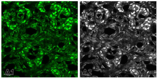 Example of the application of the split channels method. (A1) The split green channel for the expression of ETB in the carotid body of SHRs. (A2) Converted fluorescent color image to grayscale image. Original magnification ×63, scale bars 20 µm.