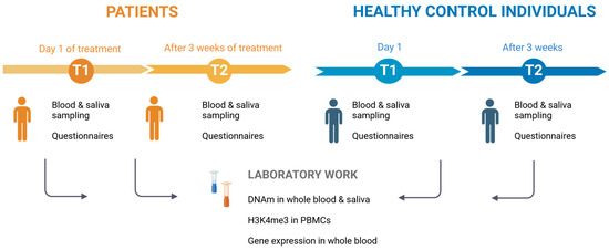 Ethylenediaminetetraacetic tubes (EDTA, BD, Heidelberg, Germany) and saliva samples (Oragene® DNA Collection Kits, DNA Genotek, Ottawa, ON, Canada) were collected at both timepoints (T1 and T2). The DNA was extracted from blood samples using the QIAamp® DNA Blood-Maxi Kit (Qiagen, Hilden, Germany [60,61]), and with Oragene® prepIT•L2P for saliva samples (DNA Genotek, Ottawa, ON, Canada), respectively, according to the manufacturer’s instructions. 500 ng genomic DNA was bisulfite converted using the EpiTect Fast Bisulfite Kit (Qiagen) [62,63] according to the manufacturer’s instructions. Bisulfite converted DNA was eluted in 20 µL elution buffer and stored at −20 °C until further analyses.
