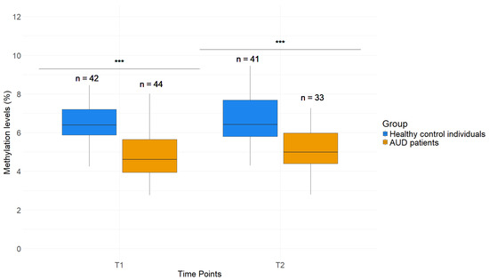 The GDAP1 DNAm level was significantly lower in AUD patients in comparison to healthy control individuals in whole blood samples. Three different CpG sites, which were previously found to be differentially methylated by Brückmann et al. [23], were analyzed. Due to their proximity and significant strong correlation (Tables S3 and S4), the methylation levels were averaged. Healthy control individuals revealed an average GDAP1 DNAm level of 6.49 (±1.08) % (T1) and 6.67 (±1.22) % (T2), while AUD patients displayed lower GDAP1 DNAm levels at both timepoints, with 4.86 (±1.20) % at T1 and 5.12 (±1.15) % at T2. The difference between patients and healthy control individuals was highly significant at both timepoints (p < 0.001, Figure 2).