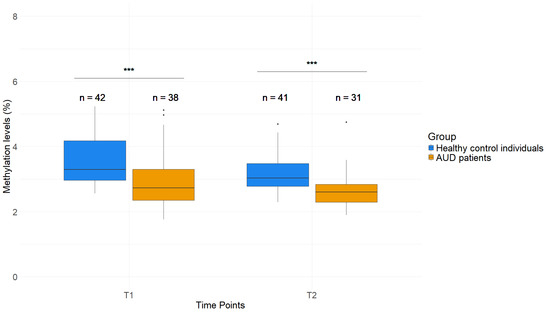 Saliva GDAP1 methylation, which was not investigated so far, is also altered in AUD patients compared to healthy control individuals. The same CpG-sites were tested in saliva samples and averaged for further analysis (Tables S5 and S6). Similar to the whole blood samples, a lower average GDAP1 DNAm was observed when comparing patients to healthy control individuals, with 2.90 (±0.81)% and 3.57 (±0.80)% (T1), as well as 2.64 (±0.57)% and 3.17 (±0.58)% (T2), for the respective groups. The GDAP1 methylation levels differed significantly between patients and healthy control individuals (p < 0.001, Figure 3) at both timepoints. This suggests that AUD-mediated effects on DNAm of GDAP1 are not limited to blood and can also be measured in alternative peripheral tissues.