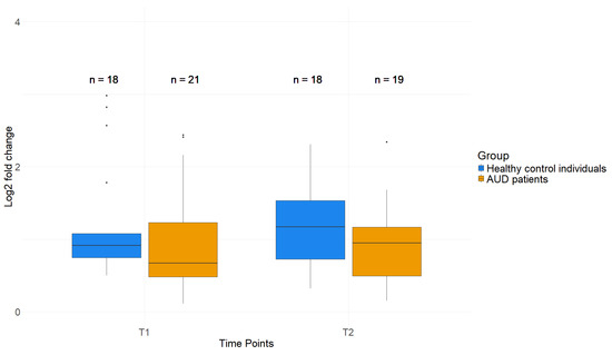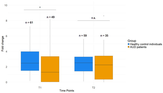 H3K4me3 fold change in AUD patients and healthy control individuals at T1 and T2. Wilcoxon rank sum test. * (p < 0.05), n.s. (p = not significant). p-Values were corrected by Benjamani–Hochberg correction.