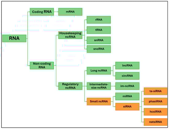Small interfering RNAs (siRNAs) are 21, 22, and 24 nt molecules. They are classified into the classes of trans-acting siRNAs (tasiRNAs), phase-acting siRNAs (phasiRNAs), heterochromatic siRNAs (hcsiRNAs), and natural antisense siRNAs (nat-siRNAs) (Figure 1) []. siRNAs are a subclass of small regulatory RNAs formed from RNA duplexes. Duplexes can be formed during viral RNA replication by the transcription of inverted repeat sequences or by the action of endogenous RNA-dependent RNA polymerases [].
