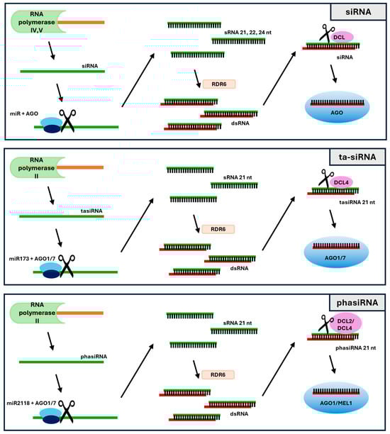 Primary siRNA transcripts have a cap at the 5′ end and a poly(A) tail at the 3′ end. The first step in siRNA maturation is cutting the primary transcript to 22 nt with miRNA/AGO. During biogenesis, the presence of RdR2 polymerase is required. RdR2 recognizes the transcripts and uses them as a matrix to synthesize complementary RNA strands. As a result, multiple dsRNAs are formed from the original transcript. The DCL endonuclease trims the dsRNA into 21 nt ta-si/phasiRNA (DCL2/4) or 24 nt phasiRNA (DCL3b). Argonaute protein (AGO)-containing RISCs are incorporated into the duplex after one of the siRNA strands is degraded. The 21 nt ta-si/phasiRNAs are linked to AGO1. The AGO proteins that bind the 24 nt phasiRNA have yet to be fully understood, but recent studies suggest that they may be AGO2b and AGO18 []. This detailed process of siRNA biogenesis provides a comprehensive understanding of how these regulatory molecules are formed and function in plants.