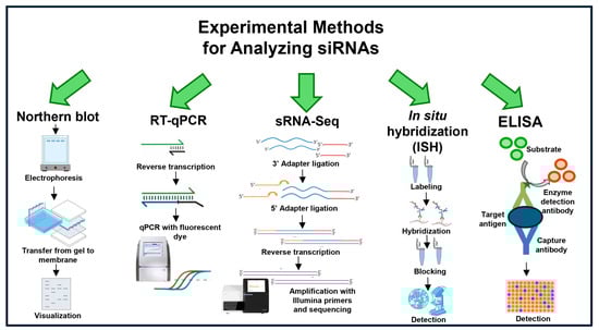 One method for siRNA detection is a pattern analysis based on Northern blot analysis, but the disadvantages of the presented technique are that it is time-consuming and has low sensitivity [,] (Figure 4). One of the most important steps is to obtain high-quality RNA from samples containing a fraction of sRNAs. The method involves the isolation of total RNA followed by electrophoretic separation in a polyacrylamide gel under denaturing conditions. Denaturation is achieved by adding urea, preventing secondary structure formation. The RNA is then transferred to a nitrocellulose or nylon membrane by electrotransfer or a capillary method. The siRNA sequences are hybridized to complementary probes on the membrane. The probes are either fluorescently or radioactively labeled, and the reaction conditions are controlled to match the thermodynamic properties of the probes. For detection, unbound probes are removed, and the image is developed on autoradiographic film or by fluorescence detection [].