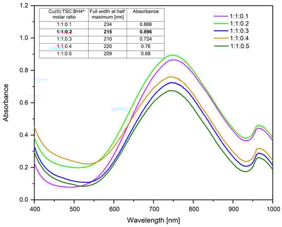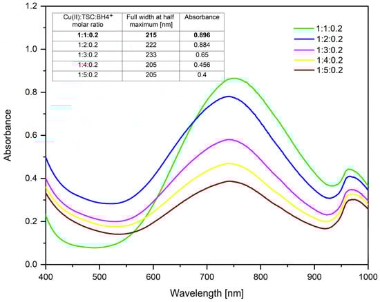 From the resulting spectra, it can be observed that at the molar ratio Cu(II):TSC: = 1:1:0.2 is the highest absorbance, which is correlated with the highest concentration of CuNPs []. The full width at half maximum and the absorbance values are also presented in Figure 2.