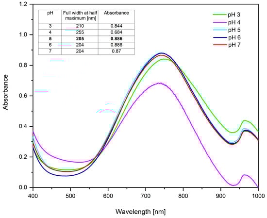 From the spectra obtained, it can be observed that the optimal pH is between 5 and 6, because the spectra’s absorbance is higher, indicating the highest concentration of CuNPs [,,]. Full width at half maximum was also calculated.