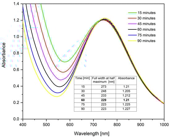 It can be observed that the synthesis does not take place instantly and is completed after 90 min. Moreover, for more detailed study, full width at half maximum determinations were performed. From the obtained results, it is observed that with the increase in the homogenization time, full width at half maximum decreases to λ = 223 nm, the absorbance increases and implicitly the CuNP concentration increases, which indicates that the monodispersity of the colloidal system increases []. As no major changes in absorbance or full width at half maximum occur between 60 and 90 min, a homogenization time of 60 min was considered sufficient for subsequent studies.