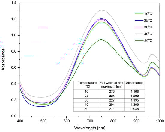 The optimal temperature for this synthesis is between 10 and 30 °C, as can be seen in Figure 5. Although an increase in absorbance can be observed at 40 °C, this sample is unstable, because after 5 h, a precipitate was observed. The full width at half maximum determination was also performed.