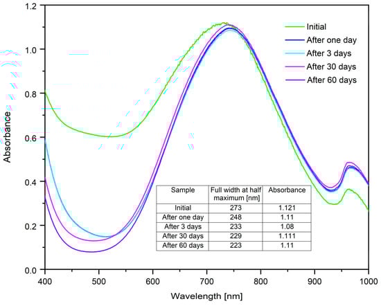 To highlight the stability of CuNPs, UV–Vis spectra were obtained at different time intervals (Figure 6) for the sample synthesized under optimal conditions: molar ratio Cu(II):TSC: = 1:1:0.2, pH = 5, homogenization time 60 min and temperature 25 °C. Thus, the sample was kept in the dark inside a drawer at 25 °C during this process, resulting in the following spectra: