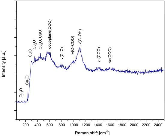In Figure 8, the Raman spectrum for CuNPs synthesized under optimal conditions is presented: molar ratio Cu(II):TSC: = 1:1:0.2, pH = 5, homogenization time 60 min and temperature 25 °C.