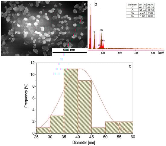 The morphological and topographical properties of CuNPs were examined by scanning electron microscopy. In addition, the SEM study was used to estimate the average size of CuNPs [,]. From SEM microscopy (Figure 9a), it is observed that the obtained CuNPs appear in the form of nanoclusters made up of spherical/quasi-spherical nanoparticles, uniformly dispersed. In the EDX spectrum (Figure 9b), the presence of C, O and Na can be observed, all of which are specific to trisodium citrate, and the presence of Cu confirms the formation of copper particles. Carbon and oxygen peaks in the samples verified the presence of carbon-based stabilizers []. The C peak in the spectrum can be attributed to the carbon tape used to mount the sample on the stub. From Figure 9c, it can be seen that the average diameter of CuNPs is 37.5 nm.