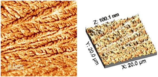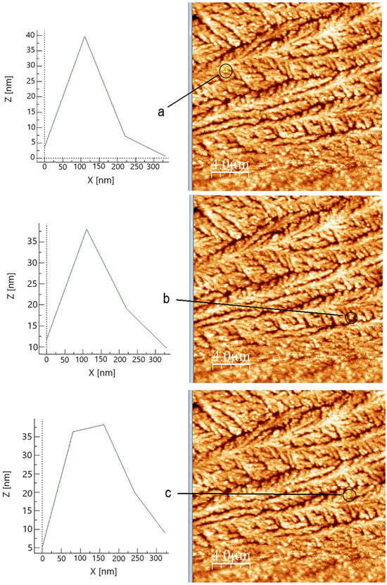 However, it should be considered that defects arise during the AFM measurement involving the tip radius curvature effect, resulting in peaks broadening []. Therefore, the profile analysis of the spheres is lacking precision, and as result, the calculated size may be erroneous. It is visible that the base of the nanoparticle is always more enlarged in comparison to the tip of the particle. However, the height of the nanoparticles measured in several areas is between 25 and 40 nm, corresponding to the SEM data.