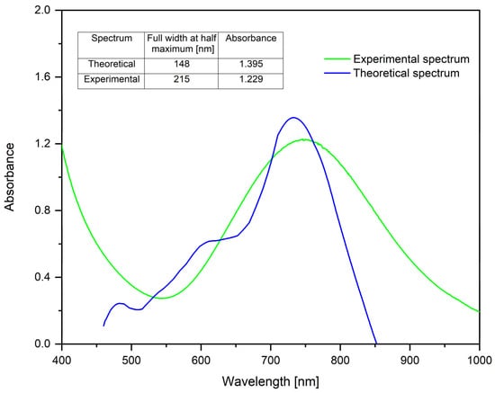 As can be seen, the theoretical spectrum does not perfectly overlap with the experimental one. This may be because the theoretical spectrum was obtained for theoretical nanoparticles with a diameter of ~30 nm, monodisperse. It can also be seen that the full width at half maximum of the experimental spectrum is slightly higher, which implies that the experimentally obtained CuNPs are not exactly monodisperse, the absorbance being lower, so the CuNP concentration is lower compared to the theoretical one.