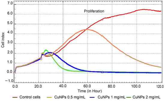 The literature reports that CuNPs are more cytotoxic to human cells than other metal oxide nanoparticles []. Therefore, CuNPs can be used in the treatment of several types of cancer, including liver cancer [], lung cancer [] mammalian cancer [,], cervical cancer [] and pancreatic cancer [].