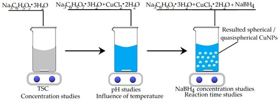 Chemical reduction with sodium borohydride is one of the most widely used methods, due to the rapid reduction rate and relatively easy control of particle size. Determining the optimal amount of NaBH4 in the synthesis of CuNPs is a crucial aspect for obtaining nanoparticles with desired sizes, shapes and properties.