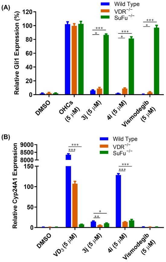 Effects of aromatic A-ring 23-oxavitamin D3 analogues on Gli1 down-regulation (A) and Cyp24A1 up-regulation (B) in C3H10T1/2 cells under 24 h. (*) p < 0.05; (**) p < 0.01; (***) p < 0.001. Gli1 down-regulation of 3j and 4i was modestly reduced in VDR−/− cells, whereas it was mostly abolished in SuFu−/− cells. Cyp24A1 up-regulation of 3j and 4i was significantly reduced in both VDR−/− and SuFu−/− cells.