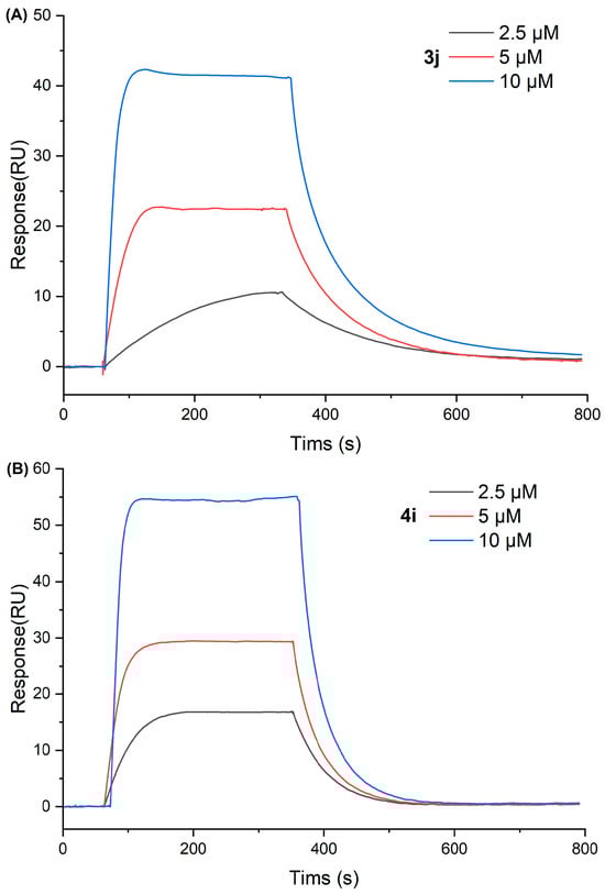 SPR sensorgram for 3j (A) and 4i (B) at concentrations ranging from 2.5 μM to 10 μM for interaction with Smo.