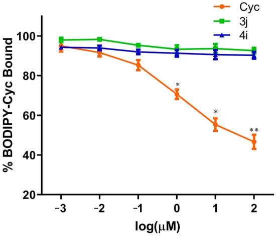 Displacement of BODIPY-Cyc by 3j and 4i in HEK293T cells overexpressing Smo. (*) p < 0.05; (**) p < 0.01 vs. control. Cyc displaced BODIPY-Cyc in a dose-dependent manner, and neither 3j nor 4i affected BODIPY-Cyc-Smo binding interactions up to 10 μM.