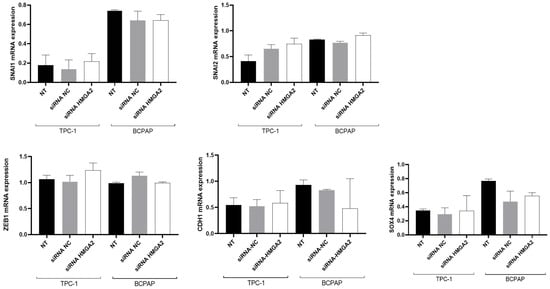In our previous study, we showed that HMGA2 silencing by siRNA as well as MAPK signaling inhibition decreased invasion in TPC-1 and BCPAP cells, while did not impact proliferation or apoptosis []. We also showed that the MAPK signaling pathway regulates EMT-related genes and HMGA2 expression in PTC cell lines. Since HMGA2 contributes to the transcriptional regulation of numerous genes by binding to DNA, we hypothesized that the MAPK signaling pathway may govern the expression of EMT-related genes through HMGA2. To investigate this, we performed RT-qPCR analyses on the main EMT-related genes, three days after specifically knocking down HMGA2 using siRNA transfection in TPC-1 and BCPAP cells, both having high levels of endogenous HMGA2 expression []. To minimize non-specific effects due to off-target gene silencing, commonly present when transfecting siRNA at high concentrations (>100 nM), we used a 20 nM concentration of siRNA for the transfections, lower than those used in most similar studies [,]. To verify that the control itself did not have any effects, we also included a group of non-transfected (NT) cells to monitor the effects of transfection, obtain basal gene expression and detect any non-specific effects of the siRNA-negative control. HMGA2 siRNA transfection effectively reduced both HMGA2 mRNA and protein expression 72 h post-transfection, as described in our previous study []. For both cell lines, no significant changes in the mRNA expression levels of SNAI1, SNAI2, ZEB1, CDH1 and SOX4 compared to cells transfected with a control siRNA was observed (Figure 1), suggesting that HMGA2 does not modulate the transcription of those EMT-related genes.