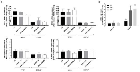 Since several studies characterized HMGA2 as an inducer of EMT in response to TGFβ through the regulation of SNAI1/2 expression [], we aimed to define the impact of HMGA2 on EMT in response to TGFβ in thyroid cells. We determined the optimal concentration and duration of TGFβ treatment required to induce the expression of genes known to be activated by this pathway and linked to the EMT process. We also analyzed by Western Blot the expression level of SMAD2 phosphorylation (P-SMAD2) following 30 min, 1 and 24 h of treatment with TGFβ1 at different concentrations (1, 10, 20 and 100 ng/mL) in TPC-1 cells. As shown in Supplementary Materials Figure S1a, the TGFβ signaling pathway is not endogenously activated in TPC-1 cells, as evidenced by the absence of SMAD2 phosphorylation in cells not treated with TGFβ (C-). In contrast, 30 min of treatment with 1, 10, 20 or 100 ng/mL TGFβ1 led to the activation of the canonical TGFβ signaling pathway, characterized by the presence of SMAD2 phosphorylation (P-SMAD2). This activation persisted at least up to 72 h following a 10 ng/mL treatment (Figure S1a, right panel). We further analyzed by RT-qPCR the expression of EMT-related genes in TPC-1 and BCPAP cells 72 h after transfection with a siRNA targeting HMGA2 or a control siRNA, as well as in non-transfected cells, all treated or not for 24 h with TGFβ1 (10 ng/mL). The experimental scheme is shown in Figure S1b. As expected, treatment with TGFβ for 24 h of non-transfected TPC-1 and BCPAP cells induced the transcription of EMT-related genes such as SOX4, SNAI1 and SNAI2 and repressed TGFBR2 mRNA expression (Figure 2a) [,]. However, no significant difference in the mRNA expression of those genes was measured in HMGA2 siRNA transfected cells after stimulation with TGFβ (Figure 2a), suggesting that HMGA2 is not involved in their induction by TGFβ in these conditions. Additionally, we measured by RT-qPCR HMGA2 mRNA expression following 1, 20 or 24 h of TGFβ1 treatment in TPC-1 cells and observed no change in expression until 24 h of treatment while as expected, the mRNA levels of SNAI2, known to be induced by this pathway (see Supplementary Materials Figure S1c) strongly increased (Figure 2b). These findings suggested that while TGFβ induced EMT-related genes transcription in thyroid cancer cells, HMGA2 did not influence this process. Additionally, HMGA2 mRNA expression did not appear to be regulated by TGFβ in these cells.