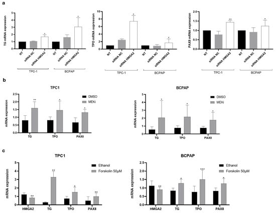 PTC progression is accompanied by dedifferentiation and constitutive activation of the MAPK signaling pathway which downregulates the expression of genes involved in iodine metabolism, dampening responses to RAI therapy []. Loss of differentiation following repression of thyroid-specific genes such as sodium/iodide symporter (NIS), thyroglobulin (TG), TSH receptor (TSHR), thyroperoxidase (TPO), transcription factors paired box gene 8 (PAX8) and thyroid transcription factor-1 (TTF1) is common. To investigate whether HMGA2 is involved in the dedifferentiation process, we examined the mRNA expression levels of TG, TPO and NIS as well as the transcription factor PAX8 in the TPC-1 and BCPAP cell lines. Cells were either transfected with a siRNA targeting HMGA2, with a control siRNA, or left untransfected. For both cell lines, a significant increase in the expression of TG, TPO and PAX8 mRNAs was observed after HMGA2 knockdown, as shown in Figure 3a. Basal expression of NIS mRNA was undetectable in both TPC-1 and BCPAP cell lines, preventing the interpretability of the findings regarding the effect of HMGA2 on NIS expression. Moreover, treatment of TPC-1 and BCPAP cells for 24 h with trametinib, a MEK inhibitor which was shown to reduce HMGA2 mRNA expression levels [], increased TG, TPO and PAX8 mRNA levels (Figure 3b), suggesting that the MAPK pathway induces cell dedifferentiation in papillary thyroid carcinomas through HMGA2. Since thyroid cell differentiation is induced by the cAMP-dependent pathway, we treated the cells for 48 h with forskolin, an adenylate cyclase activator, to activate this pathway. In this condition, HMGA2 mRNA expression was diminished while TG, TPO and PAX8 mRNA levels were enhanced (Figure 3c), reinforcing the potential role of HMGA2 in thyroid dedifferentiation.