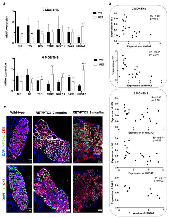 Cell lines serve as only partial models of tumors in vivo, yet they often inadequately represent the complexity of tumors. Among thyroid cell lines, the expression of differentiation genes is typically low, and in some cases, undetectable. To address the limitations of cell line models and investigate the in vivo relevance of our findings, we used the RET/PTC3 transgenic mouse model. These mice express in their thyroid and under the control of the thyroid-specific thyroglobulin promoter, the human RET/PTC3 rearrangement. The abnormal expression of the RET/PTC3 oncoprotein leads to the development of solid variant of PTC and constitutive activation of the MAPK and PI3K signaling pathways [,]. These mice have been extensively characterized in our laboratory, and are a good model of human PTC, especially in young animals (2 months) [,]. We have previously shown that HMGA2 expression was increased in the RET/PTC3 thyroids of 2- and 6-month-old mice []. Here, we measured the expression of thyroid differentiation markers and transcription factors by RT-qPCR. As shown in Figure 4a, at 2 months, HMGA2 mRNA expression was significantly increased, while NIS and TG mRNA levels were significantly decreased in the thyroids of RET/PTC3 mice compared to wild-type thyroids. On the other hand, the expression levels of TPO, TSHR, NKX2.1 and PAX8 remained similar between conditions. A significant inverse correlation between the mRNA expression of HMGA2 and that of NIS or TG was observed (R = −0.48, p = 0.04; R = −0.53, p = 0.016 respectively) (Figure 4b). In 6-month-old RET/PTC3 mice, which are in a more advanced stage of tumorigenesis, a similar increase in HMGA2 mRNA expression and decrease in NIS and TG mRNA expression were detected. In addition, a decrease in PAX8 mRNA expression was also present (Figure 4a). Again, an inverse correlation between the mRNA expression of HMGA2 and that of NIS, TG or PAX8 was observed (Figure 4b) (R = −0.45, p = 0.06; R = −0.57, p = 0.01, R = −0.81, p = 0.002 respectively). TPO mRNA was not modulated while TSHR and NKX2.1 mRNA levels were increased in the RET/PTC3 thyroids. The increased expression of HMGA2 and decreased expression of TG were confirmed at protein levels by immunostaining in the thyroids of 2- and 6-month-old RET/PTC3 mice (Figure 4c).