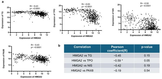 HMGA2 mRNA expression is inversely correlated to TG, TPO, NIS and PAX8 mRNA expression in human PTC. Correlation analysis was performed between HMGA2 and TG, TPO, NIS or PAX8 mRNA expression (a) in human PTC based on TCGA RNA-seq data (502 PTC, 59 Normal tissues) and (b) in 10 (TG, NIS) or 11 (TPO, PAX8) independent human PTC samples following RT-qPCR analyses. R = Pearson correlation coefficient. * p < 0.05.