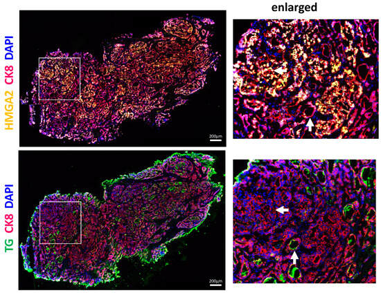2.6. Immunohistological Analyses Reveal Different Thyroid Differentiation States in PTC with HMGA2+/TG− and HMGA2−/TG+ Cells