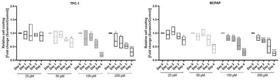 Dose and time course effects of suramin in TPC-1 and BCPAP cells. Cells were treated with increasing concentrations of suramin (25, 50, 100 and 200 μM) for 4 days and counted (control: untreated cells) (Fold change (Suramin/Control)) * p < 0.05; ** p < 0.01, *** p < 0.001 vs. untreated cells (n = 4).