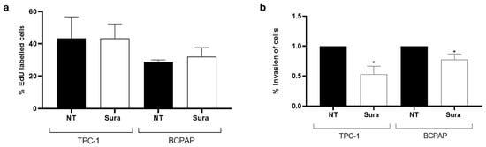 Under these conditions, suramin had no impact on proliferation in TPC-1 and BCPAP cells, as shown by the number of EdU-labelled cells which did not vary after the treatment (Figure 8a). On the other hand, a significant reduction of the invasive capacity of both cell lines was observed following suramin treatment (Figure 8b), while no effect was observed on migration.