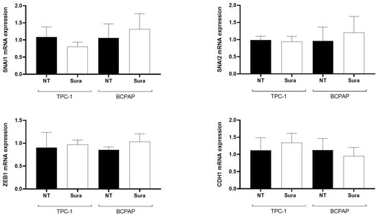 So far, suramin reproduced the effects previously observed following HMGA2 knockdown []. As mentioned above, inhibiting HMGA2 expression by siRNA did not modify the mRNA levels of several EMT markers in TPC-1 and BCPAP cells. Similarly, treating these cells by suramin did not induce any significant changes in SNAI1, SNAI2, ZEB1 and CDH1 mRNA expression (Figure 9), showing again that the drug was able to reproduce the effects of HMGA2 knockdown.