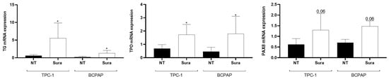 Suramin increases the mRNA expression of thyroid differentiation genes such as TG (n = 4), TPO (n = 7) and PAX8 (n = 5) in TPC-1 and BCPAP cells. Analysis of TG, TPO and PAX8 mRNA expression by RT-qPCR in TPC-1 and BCPAP cells, untreated (NT) and treated with suramin (50 µM) (Sura) for 48 h. * p < 0.05.