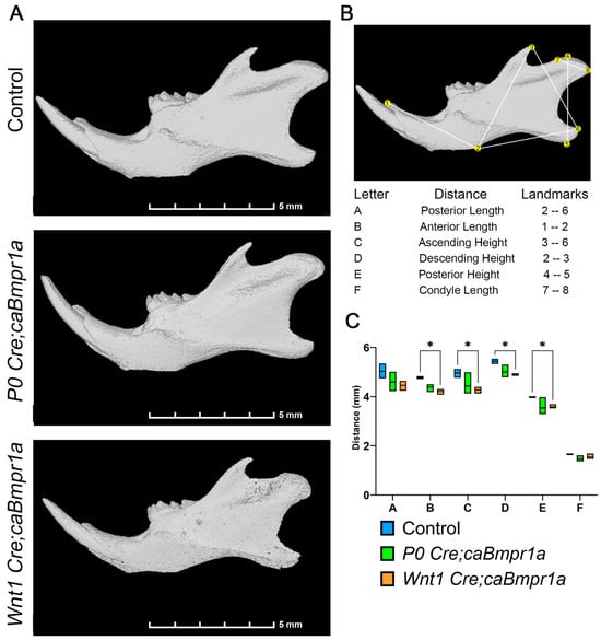 To investigate the impact of augmented BMP signaling in neural crest cells on TMJ development, we crossed transgenic mice that express a constitutively active form of Bmpr1a (caBmpr1a mice) with two widely used neural crest-specific Cre-lines, Wnt1 Cre [28] and P0 Cre [29], to generate Wnt1 Cre;caBmpr1a and P0 Cre;caBmpr1a mutant mice. Both Wnt1 Cre;caBmpr1a mice and P0 Cre;caBmpr1a mice exhibited higher amounts of pSMAD1/5/9 in cranial NCCs compared to controls [22]. These mice have also been previously characterized with short, rounded faces and craniosynostosis [22,23]. We carried out in-depth characterization of the shape of the mandible at postnatal day 17 (P17) utilizing μCT images and previously established landmarks [30,31,32,33] (Figure 1A,B). There was a significant reduction in the anterior length, ascending height, descending height, and posterior height of the Wnt1 Cre;caBmpr1a mice when compared to the controls (Figure 1B,C). P0 Cre;caBmpr1a mice showed a non-significant trend towards smaller mandibles (Figure 1B,C); however, because of the less severe phenotype, we proceeded with Wnt1 Cre;caBmpr1a mice for the rest of the analysis. The condyle length of the TMJ was similar across all three genotypes (Figure 1C).
