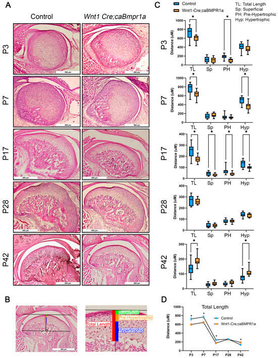 To assess the development of the TMJ in wild-type and Wnt1 Cre;caBmpr1a mice, we harvested at P3, P7, P17, P28, and P42 and analyzed the morphological changes via H&E staining. The overall shape of the TMJ was consistent at each developmental stage between control and Wnt1 Cre;caBmpr1a mice (Figure 2A). As established previously, we used the cell shape, size, and level of staining to delineate four distinct zones in the mandibular condyle: superficial, proliferative, pre-hypertrophic, and hypertrophic zones [30,34]. In this measurement, we combined the superficial and proliferative zones together. Briefly, we used the most anterior and posterior points of the condyle to draw a line, then analyzed the length of each region at the point of tangency of a line parallel to the anterior–posterior line. We analyzed the total length and three zones of the mandibular condyle to assess changes in TMJ morphology of control and Wnt1 Cre;caBmpr1a mice (Figure 2B). There was a significant reduction in the total length of Wnt1 Cre;caBmpr1a mandibular condyles at developmental stages prior to weaning, P3, P7, and P17 (Figure 2C). Furthermore, at P3, there was a significant reduction in the pre-hypertrophic zone of the Wnt1 Cre;caBmpr1a mandibular condyles (Figure 2C). At P7, the hypertrophic zone of Wnt1 Cre;caBmpr1a mandibular condyles showed a significant reduction in length (height) (Figure 2C). At P17, the Wnt1 Cre;caBmpr1a mandibular condyles had a significant reduction in all distinct chondrocyte zones (Figure 2C). In contrast, the stages analyzed following weaning showed different phenotypes. At P28, there was no significant difference in total length or any chondrocyte zone between control and Wnt1 Cre;caBmpr1a mandibular condyles (Figure 2C). At P42, however, Wnt1 Cre;caBmpr1a mice showed an longer overall length of the mandibular condyle cartilage and a larger hypertrophic zone length (Figure 2C). Over time, the total length of the mandibular condyle cartilage decreased in both control and Wnt1 Cre;caBmpr1a mice (Figure 2D).