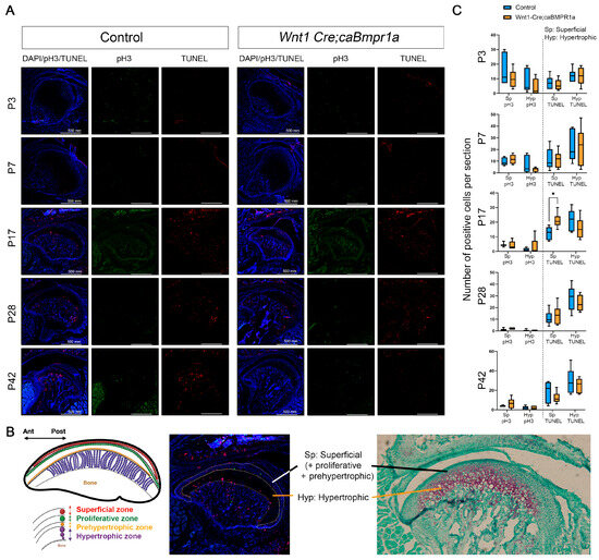 To understand the processes mediating changes in Wnt1 Cre;caBmpr1a mandibular condyle lengths, we investigated the level of cell death through the TUNEL assay and cell proliferation with phospho-histone H3 immunohistochemistry (Figure 4A). We analyzed the superficial zone and pre-hypertrophic zone together and the hypertrophic zone separately (Figure 4B). The superficial zone (Sp) is defined as areas that have low or no Safranin O stain, which includes superficial, proliferative, and prehypertrophic zones, and the hypertrophic zone (Hyp) as the area that has a dark Safranin O stain (Figure 4B). There was no difference in proliferation or cell death at P3 or P7 in either the superficial or hypertrophic zone of the Wnt1 Cre;caBmpr1a mandibular condyles (Figure 4C). There was a significant upregulation in cell death in the superficial zone of P17 mandibular condyles (Figure 4C). Additionally, we observed no significant difference in P28 or P42 cell death or proliferation in either the superficial or hypertrophic zone. There was a non-significant trend towards reduced cell death in the superficial zone of P42 Wnt1 Cre;caBmpr1a mandibular condyles.