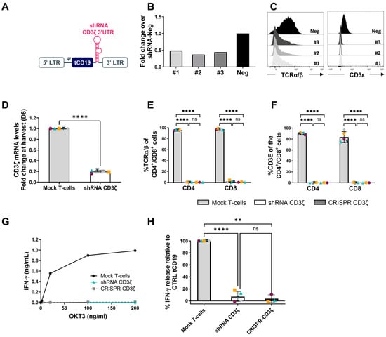 Screening of shRNAs against CD3ζ. (A) Schematic representation of the miRNA-based CD3ζ shRNA genetic constructs. (B) Screening of different (#1, #2, and #3) shRNAs targeting the 3′ untranslated region (UTR) of CD3ζ and their impact on mRNA levels of CD3ζ after transduction in Jurkat T-cells using lentiviral vectors, compared to untransduced control cells, evaluated by qPCR at harvest. (C) Representative flow cytometry histograms illustrating surface expression of TCRα/β and CD3ε in Jurkat cells transduced with control vector (Neg) or vector containing miRNA-based construct targeting CD3ζ. Cells were gated on SSC/FSC for lymphocytes and the overlaid histograms of TCRα/β+ (left) and CD3ε+ (right) within the viable cells are displayed. (D) Impact of selected miRNA-based construct (#2) transduction on CD3ζ mRNA levels in primary T-cells. Data for each of the T-cell arms are presented as mean +/− SD. Each individual point represents a donor. **** p value of <0.0001. (E–H) Impact of selected miRNA-based construct (#2) transduction in primary T-cells from healthy donors, and as compared to primary T-cells transiently nucleofected with ribonucleoproteins of Cas9 protein assembled with tracrRNA-crRNA-CD247 duplex (CRISPR CD3ζ). (E,F) Histograms illustrating the % of TCRα/β+ and CD3ε+ cells in CD4+ and CD8+ T-cells of each arm at harvest (day 8) as evaluated by flow cytometry. Bar graph data are presented as mean +/− SD. Each individual point represents a donor. **** p value of <0.0001. ns: not significant. (G) T-cells (from one representative healthy donor) transduced with a vector containing miRNA-based construct #2 targeting CD3ζ or with control vector (Mock T-cells) or T-cells nucleofected with CRISPR against CD3ζ, were stimulated through TCR using anti-CD3 antibody (OKT3). After a period of incubation of 24 h, the IFN-γ secretion in the supernatant (ng/mL) was quantified by ELISA as a readout for T-cell activation. (H) Percentage of IFN-γ secretion in response to 200 ng/mL OKT3 stimulation per T-cell arm. Data are presented as mean +/− SD. Each individual point represents a donor. **** p value of <0.0001. ** p value of <0.01. ns: not significant.