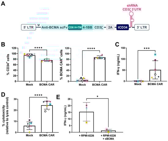 Functionality of BCMA-specific CAR expressing shRNA CD3ζ. (A) Schematic representation of BCMA-specific CAR-shRNA CD3ζ genetic constructs. CAR, chimeric antigen receptor; LTR, long terminal repeat sequence; ψ, retroviral Psi packaging element; 2A, 2A self-cleaving peptides; shRNA, short hairpin ribonucleic acid; tCD34, truncated CD34; UTR, untranslated regions. (B) Percentage of transduced CD34+ cells (left) or BCMA CAR+ cells (right) among living cells at harvest (day 10) of CAR T-cells generated from 7 healthy donors measured by flow cytometry. (C) IFN-γ secretion in the supernatant upon 24 h co-culture of CAR T-cells generated from 7 healthy donors with multiple myeloma cancer cell line RPMI-8226 (1:1 ratio), as measured by ELISA. (D) Cytotoxic activity was measured using an LDH assay in the supernatant of 24 h co-cultures of CAR T-cells generated from 7 healthy donors with multiple myeloma cancer cell line RPMI-8226 (1:1 ratio). (E) IFN-γ release of BCMA-specific CAR generated from 3 healthy donors in an RPMI-8226 co-culture with or without soluble recombinant BCMA-Fc protein (R&D Systems, 5 µg/mL). Represented are the mean ± SD. Each symbol represents one donor. **** adjusted p value of <0.0001. *** adjusted p value of <0.001. * adjusted p value of <0.1.