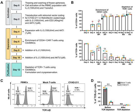 CYAD-211 clinical product development and identity. (A) Process flow chart of the CYAD-211 clinical product. (B) Percentage of transduced cells (CD34 positive population, upper panel) or TCR positive cells (TCR+, lower panel) over time during the manufacturing process. BP: before CD34+ purification step, AP: after CD34+ purification step; BD: before TCR+ depletion, AD: after TCR+ depletion. **** p value of <0.0001, *** p value of <0.001, ** p value of <0.01, * p value of <0.1, ns: not significant (versus Day 4). (C) Representative flow cytometry histogram plots of TCR expression of control T-cells transfected with a vector expressing only the tCD34 reporter (Mock) and CYAD-211 cells at Day 12. (D) Percentage of T-cell receptor positive (TCR+) cells in Mock T-cells or CYAD-211 before and after depletion of TCR positive cells at Day 12. ** p value of <0.01.
