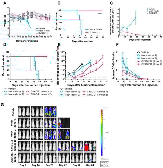 In vivo evidence of CYAD-211 lack of alloreactivity and anti-tumor activity. (A–C) Immunodeficient NSG mice (n = 5 per group) received 1.44 Gy total body irradiation one day prior to a single intravenous injection of vehicle or 20 × 106, control T-cells (Mock) or CYAD-211 (cells from 1 representative donor out of three) as a model of in vivo GvHD []. Weight kinetics as mean percentages ± SD. **** p value of <0.0001, (B) or Kaplan–Meier survival curves of mice injected with cells from one representative, and (C) human T-cell engraftment in the mouse peripheral blood as mean percentages ± SD as assessed by flow cytometry (hCD45+ hCD4+/hCD8+ viable cells). (D–G) NSG mice (n = 5 per group) were injected intravenously with the vehicle, 107 CYAD-211 or 107 T-cells transduced with control vector (Mock), 6 days following intravenous injection of 5 × 106 KMS-11-luc multiple myeloma cancer cells. (D) Kaplan–Meier survival curves, (E) kinetics of bioluminescence emitted by luciferase-expressing KMS11-luc tumor cells, (F) human T-cell engraftment in the mouse peripheral blood as assessed by flow cytometry (hCD45+ hCD4+/hCD8+ viable cells) and (G) bioluminescence images of individual mice. **** p value of <0.0001, * p value of <0.1 (versus Mock).
